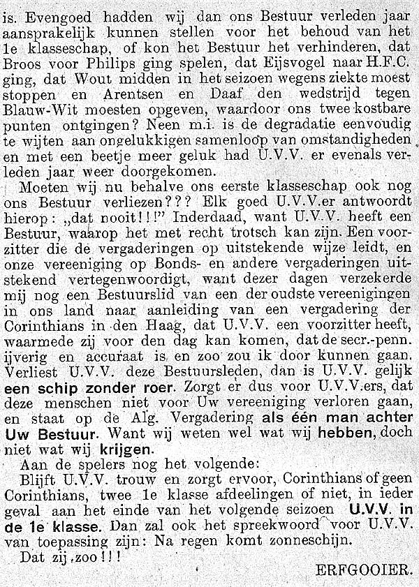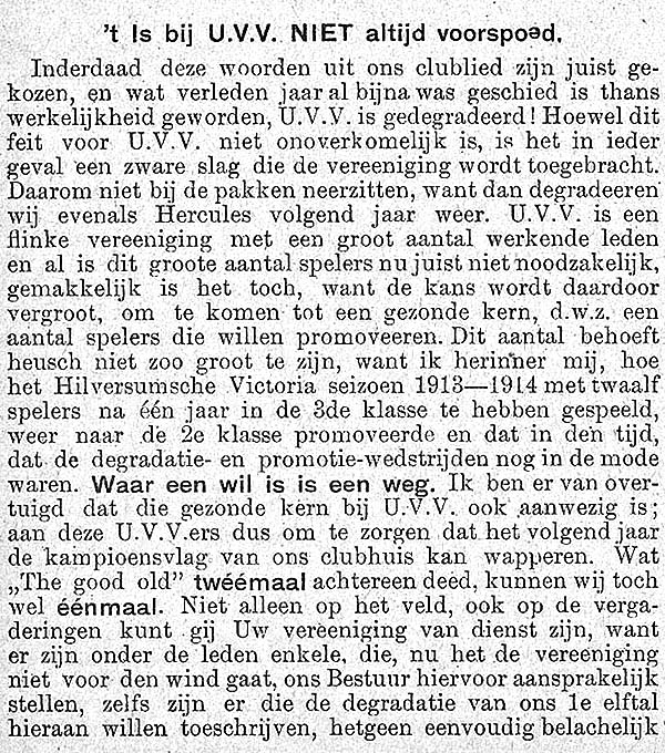 Maar wat men toen nog niet wist was het feit, dat de N.V.B. (de latere K.N.V.B.) in de zomer na veel ruzie en zeer veel vergaderingen zou besluiten tot een herindeling. En dat U.V.V. eerste-klasser zou blijven!!