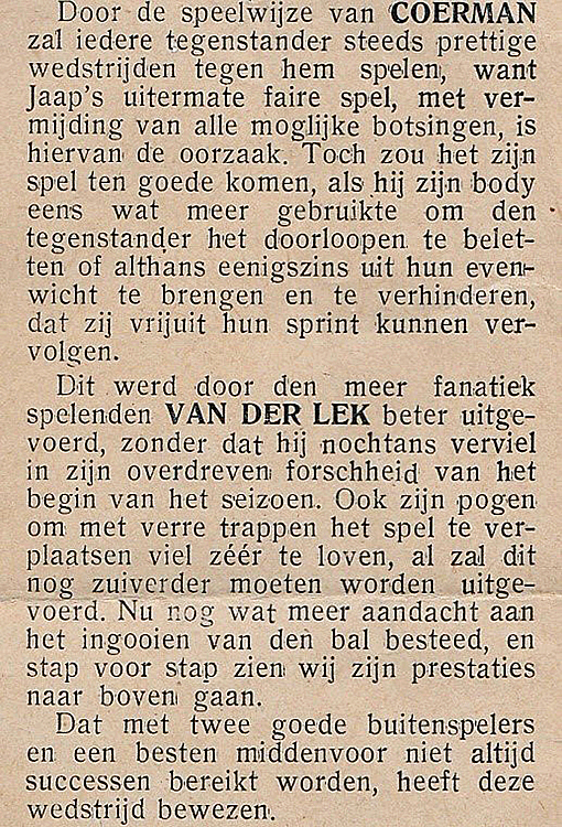 Na een wedstrijd tegen Xerxes (2-7 verlies) volgt een evaluatie. Het hele elftal krijgt ongenadig op zijn donder. Hiernaast het commentaar op een paar bekende spelers, waaronder Jaap Coerrman. Jaap speelt uitermate fair, vermijd mogelijke botsingen en pakt zijn tegenstanders niet genoeg hard aan. Wellicht is zijn postuur hier debet aan, want Jaap is niet een van de grootste. Alleen Geni Pino komt er nog genadig vanaf.