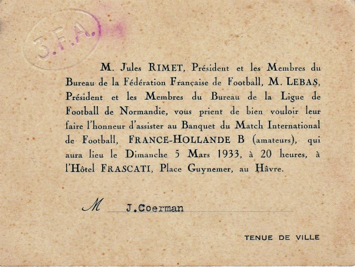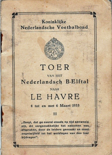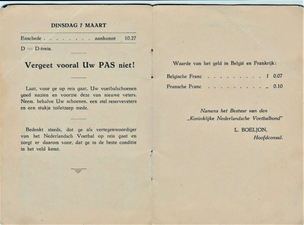 De uitnodiging voor de uitwedstrijd tegen Frankrijk B die met 3-1 verloren ging. Het was een driedaagse tip en voorzien van een toerpas met diverse tips.
