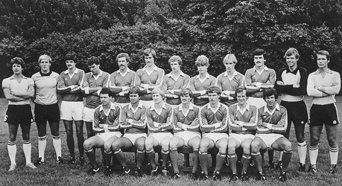 Seizoen 1981/1982. Links staand: Han Berger, de hoofdtrainer en rechts Jan Verkaik, ass. trainer.