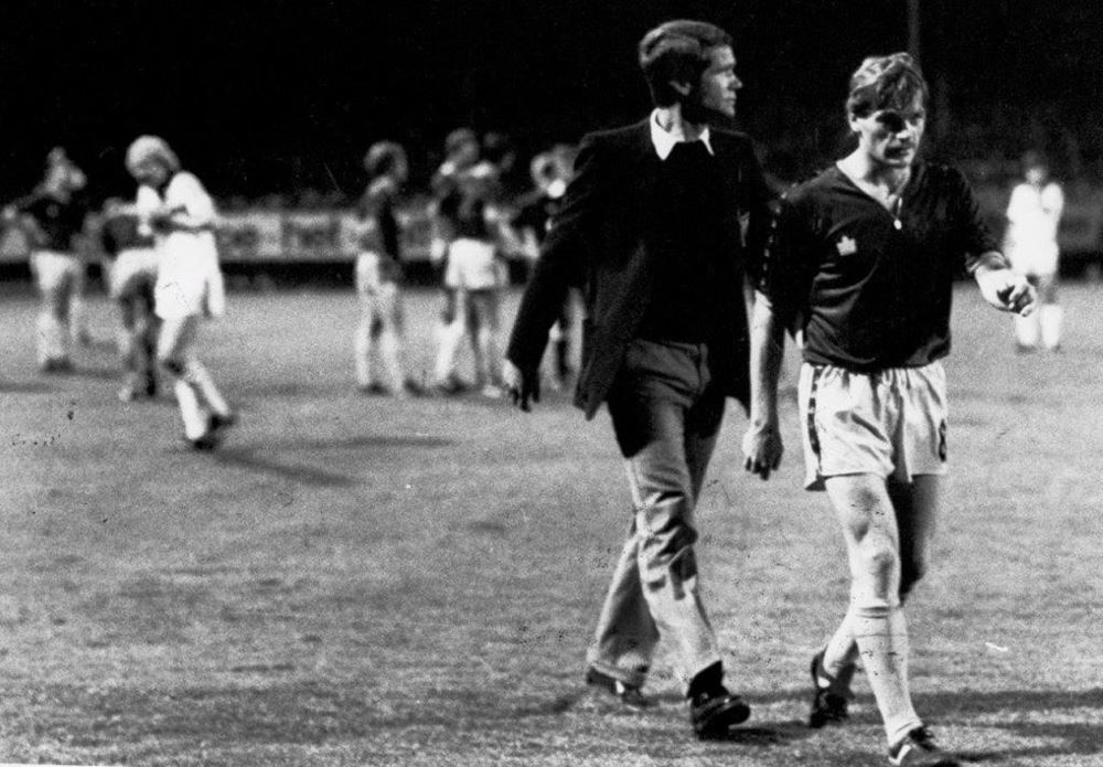 Na zijn rode kaart tegen HSV loopt Jan Wouters  met Jan Verkaik het veld af.