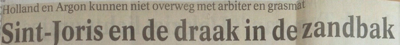 Deze krantenkop had betrekking op de wedstrijd Holland-Argon, een  wedstrijd voor de thuisploeg met een nog theoretische degradatie dreiging en voor Argon het zicht op een periode titel. Sint Joris en de draak sloeg op de scheidsrechter die door zijn pietluttige en warrige arbitrage de doodsteek toediende. De zandbak sloeg op de zeer slechte toestand van het veld.