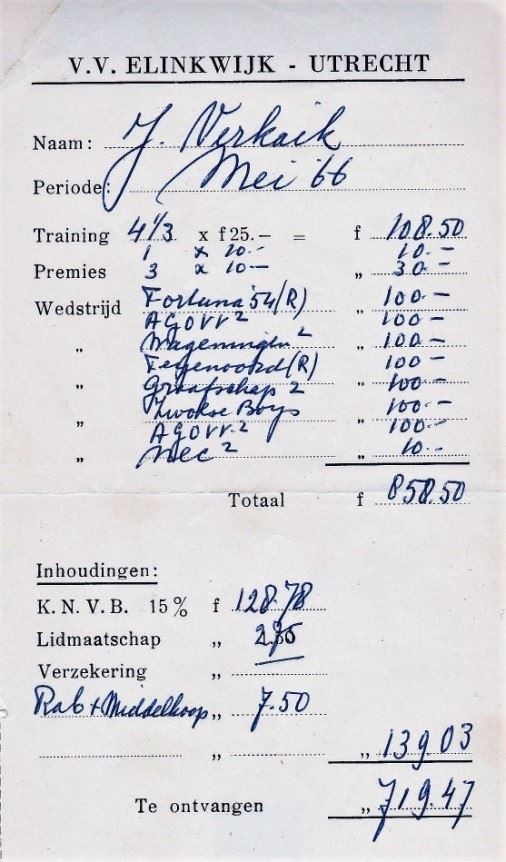 “Jan, mogen we deze loonbriefjes  in het portret plaatsen. Natuurlijk, zegt Jan, maar dan moet je wel de hoogste plaatsen.”Opvallend detail: De inhouding van 15% van de KNVB, zou dit in deze tijd ook nog gebeuren? De bijdrage voor de 2 jarige spelers Rab en Middelkoop. Dus geen gezeur achteraf meer.